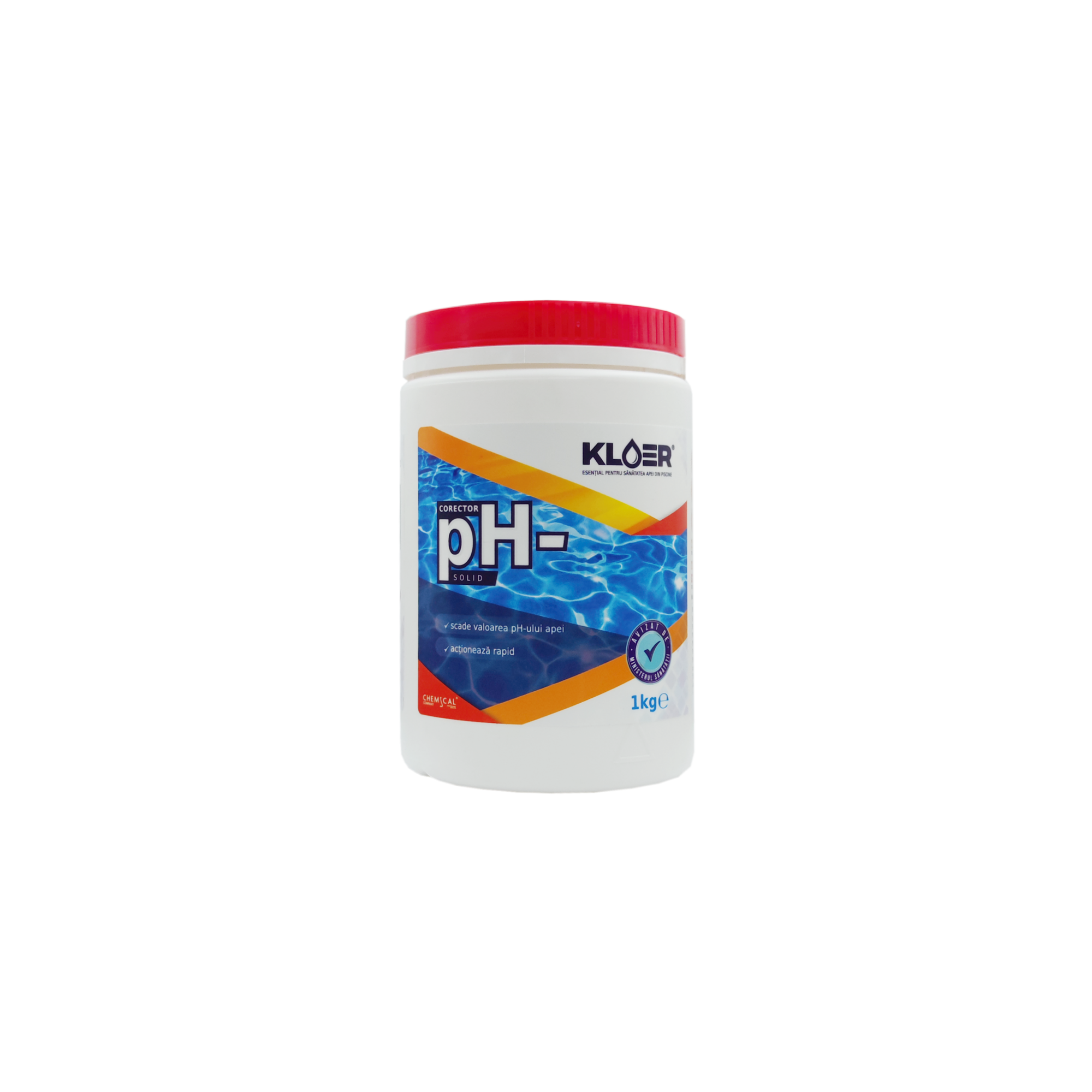 Pentru a scădea valoarea рН-lui cu 0,2 la 10 m³ de apă se adaugă 100 g de produs Corector pH- solid 1kg.